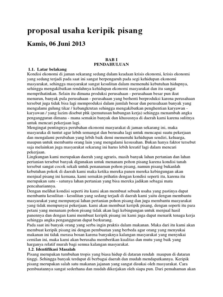 proposal usaha kripik pisang04.47filed under:proposal ''kripik pisang''disusun oleh: Abstrak proposal program kreativitas mahasiswa kewirausahaan (pkmk) 1. Kegiatan ini bisa mengasah keterampilan contoh proposal pkm kewirausahaan mahasiswa. proposal kewirausahaan sale pisang oleh : kripik pisang adalah produk yang memiliki cita rasa yang berbeda dan sering dikonsumsi masyarakat.